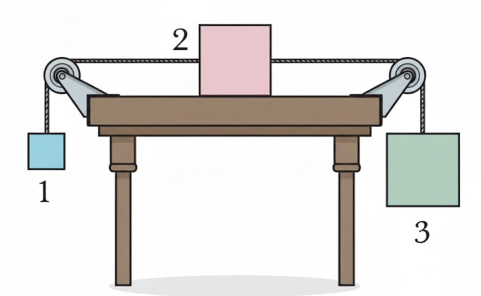 Quando os três blocos da figura são liberados a partir do repouso, aceleram com um módulo de $0,500 \text{ m/s}^2$. O bloco 1 tem massa $2 \text{ kg}$, o bloco 2 tem massa $4 \text{ kg}$ e o bloco 3 tem massa $4 \text{ kg}$. Qual é o coeficiente de atrito cinético entre o bloco 2 e a mesa? Determine as tensões nas cordas que unem os blocos.
