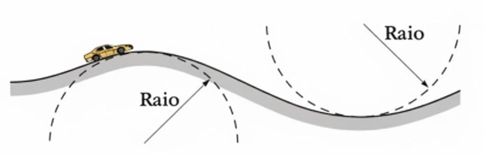 Na figura, um carro passa com velocidade constante por uma colina circular e por um vale circular de mesmo raio. No alto da colina, a força normal exercida sobre o motorista pelo assento do carro é zero. A massa do motorista é de $70,0 \text{ kg}$. Qual é o módulo da força normal exercida pelo assento sobre o motorista quando o carro passa pelo fundo do vale?