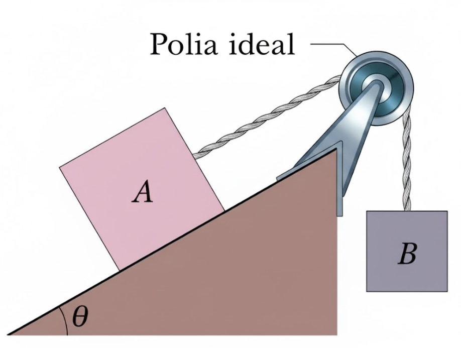 Na figura, dois blocos estão ligados por um fio que passa por uma polia. A massa do bloco $A$ é $10 \text{ kg}$ e o coeficiente de atrito cinético entre $A$ e a rampa é $0,20$. O ângulo $\theta$ da rampa é $30^\circ$. O bloco $A$ desliza para baixo ao longo da rampa com velocidade constante. Qual é a massa do bloco $B$?
