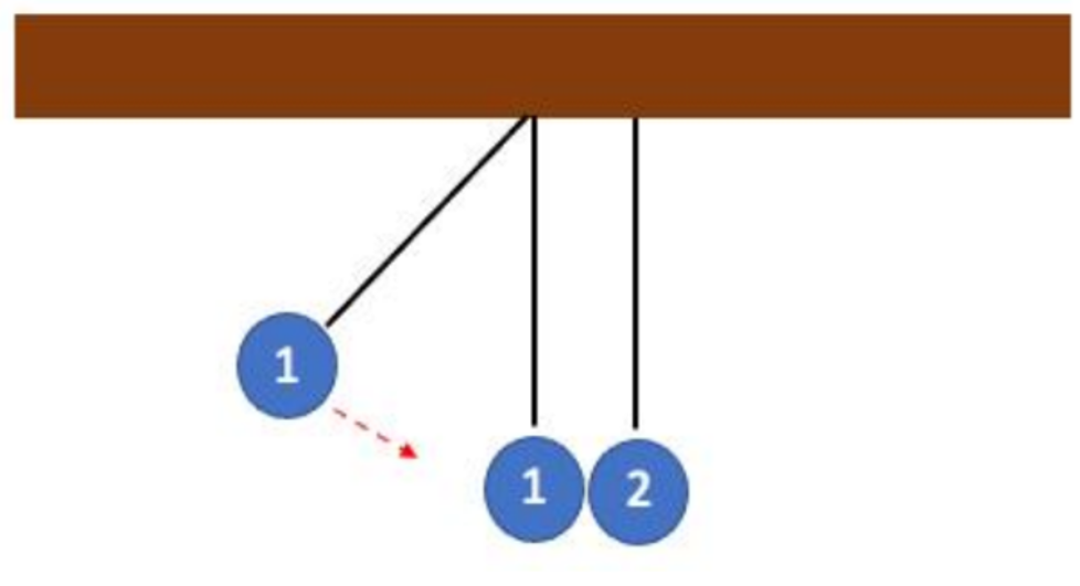 Duas esferas sólidas de inércias $𝑚_1$ e $𝑚_2$ estão penduradas por fios como mostra a figura. A esfera 1 é puxada formando o ângulo da figura e solta. Imediatamente antes da colisão a esfera 1 tem energia cinética $𝐾_1$. Considere o sistema como sendo as duas esferas. Despreze a resistência do ar. Considere a colisão como sendo elástica.