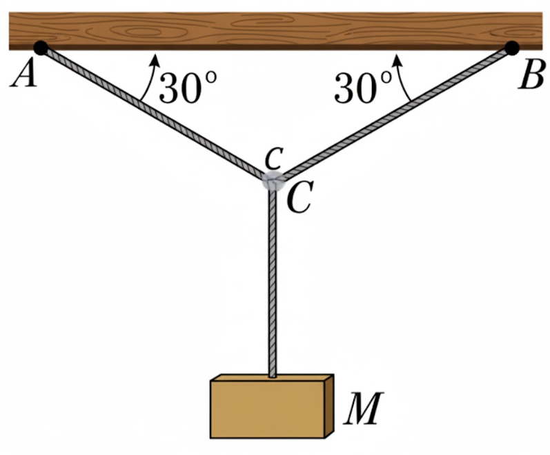 A figura mostra um bloco de massa m=15,0 text kg suspenso por três cordas. Quais são as trações nas três cordas?