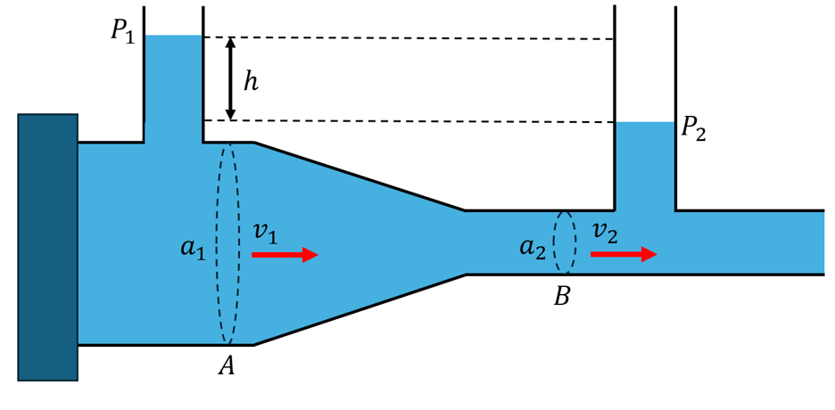 Água está fluindo através de um tubo horizontal com seção transversal diferente em dois pontos A e B. O diâmetro do tubo em A e B é de $0,6 m$ e $0,2 m$, respectivamente. A diferença de pressão entre A e B é de $1 m$ de coluna de água. Calcule o volume de água que flui por segundo (considere $\pi =3$, $\rho_{H_2O}=1 \times 10^3 \ kg/m^3$, $g=10 \ m/s^2$).